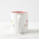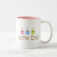 Cute two toned Pink Coffee Mug with a clever twist on the phrase "Lottie Da" Shows three cups of latte in pink, blue and green with swirly, curly steam.
