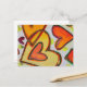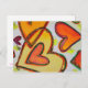 Peach, pink, and orange hearts cross over each other like clouds drifting in a sky. A green outline traces each heart. Pale yellow colour dots are like confetti between the hearts. The watercolor painting has a light layer of gold and pink on top. Customise this postcard with your personal text and images!