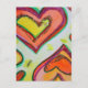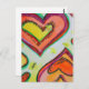Yellow, peach, and orange hearts form two concentric hearts gliding towards each other tip to tip. Pale yellow colour dots are like confetti between the hearts. The watercolor painting has a light layer of gold and pink on top.