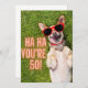 Fun milestone birthday design features photo of laughing Corgi dog with sunglasses and "Ha Ha You're 50"