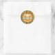 A laughing pumpkin emoji on a green, black, and orange striped sticker, perfect for Halloween.