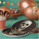 Fun Halloween paper party plates feature slightly creepy, kinda funny photo of laughing skeleton with customisable text