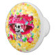 * Lovely calavera wearing a colourful red bonnet, set upon a yellow flowery background. This ceramic pull is available in three style options. Add a bit of fun to your home decor for Dia De Los Muertos!