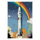 A sleek space rocket blasts off, its trail of fire and smoke rendered in vibrant rainbow retro artwork, creating a striking fusion of futuristic propulsion and nostalgic colour. The dynamic hues streak across the sky, evoking a sense of wonder and excitement as the rocket ascends into the cosmos.