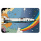 A sleek space rocket blasts off, its trail of fire and smoke rendered in vibrant rainbow retro artwork, creating a striking fusion of futuristic propulsion and nostalgic colour. The dynamic hues streak across the sky, evoking a sense of wonder and excitement as the rocket ascends into the cosmos.
