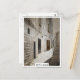 Postcard of laundry consisting of white blankets hanging to dry in the sun on the facade of a white stone house in an alley with sandstone stairs in a town in Italy, creating a typical Italian/mediterranean street view. It has a white edge and the text 'Toscana'.