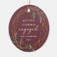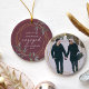 Celebrate your first Christmas as an engaged couple with this charming and festive ornament. Round design features "our first Christmas engaged" in modern block and script lettering, surrounded by a faux gold foil border accented with green winter leaves. Personalise with your names and the year, and add a photo to the back with a matching golden geometric frame.