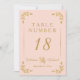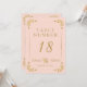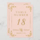 "Laurel Leaf Typography Blush Gold Table Numbers Wedding Invitation." Laurel leaf wreath with typography text layout in gold glitter look with a background colour of warm pastel blush pink. Art by internationally licensed artist and designer, Audrey Jeanne Roberts, copyright.