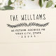 Return address rubber stamp featuring your surname/family name in a whimsical style font and the address below beneath a separating laurel leaf divider.