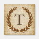 A delicate laurel wreath is layered over a vintage sheet music background in the classic Roman style. This design is personalised with the monogram "T" in a rich sienna tone.