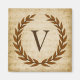 A delicate laurel wreath is layered over a vintage sheet music background in the classic Roman style. This design is personalised with the monogram "V" in a rich sienna tone.
