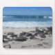 A captivating scene of ocean sea foam waves upon a sandy beach littered with lava rocks on a bright blue sky tropical day .Perfect for any beach themed decor or accessory.