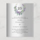 A faux silver looking background. A floral wreath made of lavender flowers and watercolored eucalyptus greenery. Personalise and add your names, details. Black text.