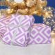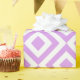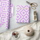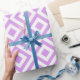 Decorative custom wrapping paper features a lavender and white meander pattern. Lavender diamonds with white borders are surrounded by light purple meanders which angle around them. White zigzags separate the winding pale purple paths and offset diamonds.