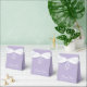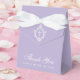 A lavender favor box for a baptism. On the flap, it has a white crest with a cross in it.