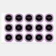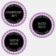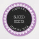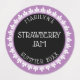 These canning label stickers feature white text for your name, contents, and date on a black circle background surrounded by a white lace border on a lavender background.