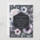 This design features a moody, romantic atmosphere with a deep color palette of lavender, muted grey-blues, and blush pinks. Delicate floral illustrations evoke a sense of vintage charm and elegant beauty. The arrangement includes roses and feathery plumes, creating a soft, artistic display.