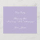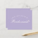 It is just white text on lavender (light purple) background, a very modern colour. The word Bridesmaid on the front and the message on the back are written in an elegant calligraphic script, the arched text "[Name] will you be my" above the word Bridesmaid in small caps.
