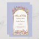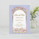 Elegant modern colourful wildflower garden design in shades of lavender, yellow and peach with gold arch on periwinkle shade background and stylish typography with monogram on the back. Just so romantic and floral for that special day of your life.