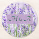 These round paper coasters with soft lavender and green inspired by the beauty of countryside lavender flowers have a location for custom names for your wedding celebration.