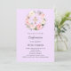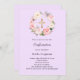 A lavender colored background, decorated with watercolored pink and white flowers in a wreath and a golden cross. Personalize and add a name and details.