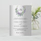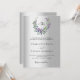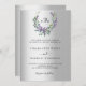 A faux silver looking background. A floral wreath made of lavender flowers and watercolored eucalyptus greenery. Personalise and add your monogram initials, names, and details. Black text.