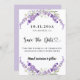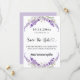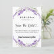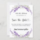 A modern and elegant Save the Date for a wedding. A white background decorated with watercolored lavender flowers. Personalize and add a date and your names. The text: Save the Date is written with a large trendy hand lettered style script with a heart.
