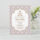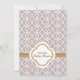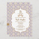 Elegant and beautiful french Moroccan inspired baby shower invitations with a repeating light purple lavender hue and gold geometric pattern design and gold floral flourishes. This upscale and luxe looking invite is perfect for any formal, exotic, Moroccan, Arabian Nights or Aladdin themed gender neutral baby shower for a boy or girl. The back of these custom, fancy frame invites can be personalised with the first name of the mummy to be and event name on the quatrefoil shape and printed ribbon look design. Artwork and design © Chrissy H. Studios, LLC. All Rights Reserved.