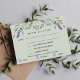 A sage green background, black text. Decorated with lavender florals and eucalyptus greenery. Personalise and add the reply by date and menu selections.