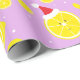 Wrapping paper with a pattern of smiling lemons wearing santa hats on a lavender background.