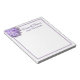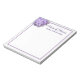 Notepad size 5x6 with lavender hydrangea flower design. Customize two lines of text at the top with business name and location, or any wording. The white paper is bordered in thin lines in purple gradient.