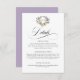 This trendy elegant wedding details card features a monogram crest with lavender and lemon floral wreath. The details of your wedding is personalised in elegant typography. The back of the card is a solid shade of lavender.