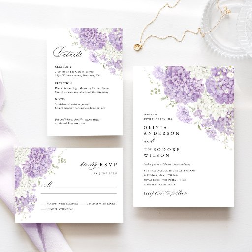 Complete the look with matching invitations, RSVP cards, details cards, and day-of wedding stationery from the same Lavender & White Hydrangea collection.