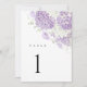 Lavender lilac and white watercolor hydrangea table number designed for an elegant, cohesive wedding reception. Soft floral artwork paired with a clean modern classic layout creates a refined table setting that blends beautifully with romantic, garden, and elegant wedding styles. Ideal for planners seeking a polished, well-coordinated reception look.