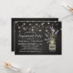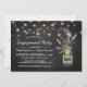 Country chic engagement party invitations featuring a rustic black chalkboard background, string lights, a mason jar with purple lavender flowers, wrapped in burlap with the couples initials and a party template that is easy to personalise.