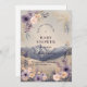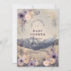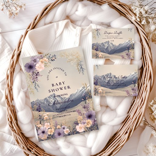 A romantic, nature-inspired baby shower design featuring soft wildflowers, delicate botanicals, and a serene mountain landscape. The muted pastel palette and painterly details create a calm, timeless look—perfect for an elegant outdoor, rustic, or countryside baby shower with a storybook feel.