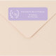 A lavender colored background. Decorated with a white wreath. Personalize and add your names, address and your first name initials. White text.