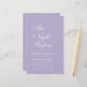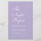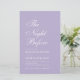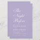 A simple, minimalist lavender rehearsal dinner invitation. It has just white text on lavender (light purple) background. The title "The Night Before" is written in elegant calligraphy, the occasion "Rehearsal Dinner" and the name are written in larger caps, the rest in small caps. The text is left aligned.
