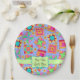 For quilting events, meetings, and classes in your store or business, make an impression serving from these paper plates. Great advertising promotion for your business or guild. The design on this paper plate combines favourite quilt blocks plus unique blocks to form a quilt design with vibrant and dynamic colours on a periwinkle lavender purple background. A light green bar and emblem gives a place for the customisable words. The patchwork blocks feature stars, applique, pinwheel, log cabin and other favourite quilt blocks. Small flowers and blue dots are on the background between the tossed blocks. This quilt art is from fabric and quilt designer Phyllis Dobbs and is available on coordinating products in this store. Fully customisable - change the words for a quilt meeting or event.