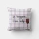 Red wine in stemware glass on purple and white plaid background with fun quote.