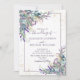 Create the perfect wedding invitation with this trendy design featuring lilac lavender purple and dusty blue botanical greenery and gold floral botanical elements, faux gold dust corner elements, lavender frame and faux Carrera marble background. The back of the invitation features your favorite engagement photo. Contact designer for matching products. Copyright Elegant Invites, all rights reserved.