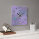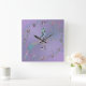 Lavender Rainbow Glass Music Notes and Clef Clock. Lavender background with a glass like musical treble clef in the center, surrounded by lavender numbers and colorful musical notes. A sweeping staff with colored music notes adds additional flair to this wall clock for your favorite musician or music lover.