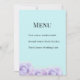 Complement your reception table scape with these exquisite lavender rose menu cards. Featuring a serene light blue background, the delicate watercolor florals provide a refreshing and sophisticated frame for your wedding meal details. This design is perfect for a spring garden wedding, an elegant tea party, or a classic floral-themed celebration, ensuring your guests have a beautiful guide to the evening's culinary offerings.