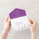 Lush and dainty purple lavender springs with coordinating buds and greenery. The RSVP is perforated making it easy to tear off and send back. The postcard is the correct size for sending via USPS at the lower postage pricing, and the back flap that overlays the postcard is large enough to cover the return address and stamp sections to avoid confusion with mailing. Personalise with your own information.
