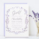 This girl baby shower invitation features a lavender floral frame adorned with butterflies and ribbons.