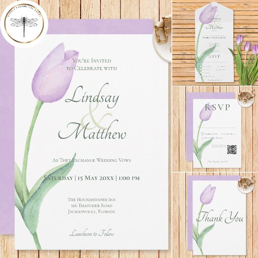 This simple invitation envelope design features a single stem lavender watercolor tulip against a pristine background. The back is a soft, slightly distressed lavender colour. Simple and elegant. It's part of the Lavender Tulip Solo Purple Modern wedding suite created by Simply Farmhouse Press.