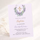 Violet background. A floral wreath made of lavender flowers, watercolored eucalyptus greenery and a golden cross. Personalise and add a name and details.