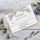 Rustic white wood as background, black text. Decorated with lavender florals and eucalyptus greenery. Personalise and add a reply by date.