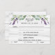 Rustic white wood as background, black text. Decorated with lavender florals and eucalyptus greenery. Personalise and add a reply by date. Add your menu selections/choices.