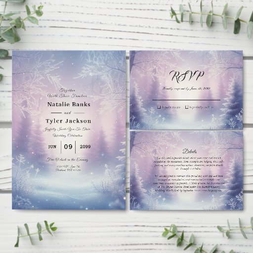 Set the tone for a magical celebration with this elegant design from the Lavender Winter Snowfall Serenade collection. Featuring a soft, snowy forest scene in delicate shades of lavender and icy blue, this invitation brings a serene winter romance to life. Perfect for cosy winter weddings or seasonal events, this design evokes the beauty of a frosted fairytale. Matching RSVP cards, enclosure inserts, envelopes, and more are available to complete your stationery suite with seamless style.